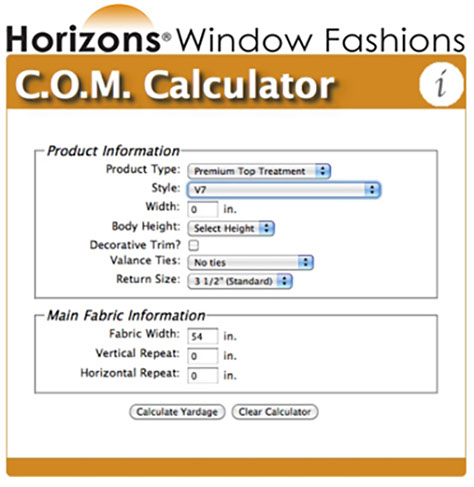 Calculating yardage requirements for fabric window fashions in customer’s own material just got a lot easier. The C.O.M. Calculator -- located at
